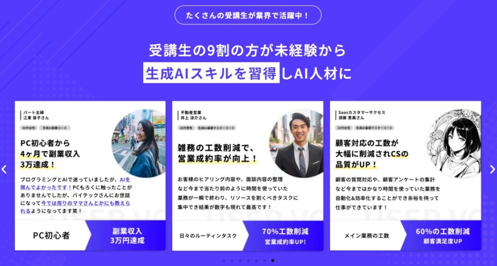 生成AIに関して基本的なところから応用まで学べますし、私の場合は副業目的だったのですが受講中に案件獲得でき目標の金額も達成できたので、とてもおすすめできるスクールです。