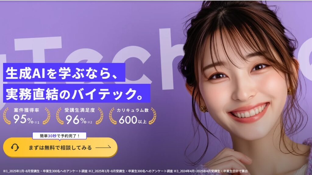本記事では、「バイテック生成AI」を検討中のあなたのために、実際に受講した人のリアルな評判・口コミはもちろん、気になる料金プランや、目的に応じて選べる5つのコースを徹底的に解説します。