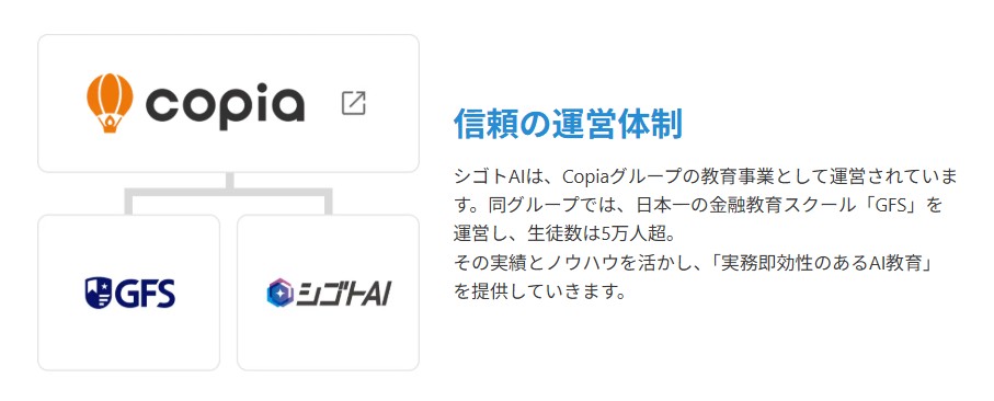 シゴトAIを運営する株式会社AI Educationは、生徒数6万人を超える日本最大級の金融スクール「GFS」を運営するCopiaグループの子会社です。