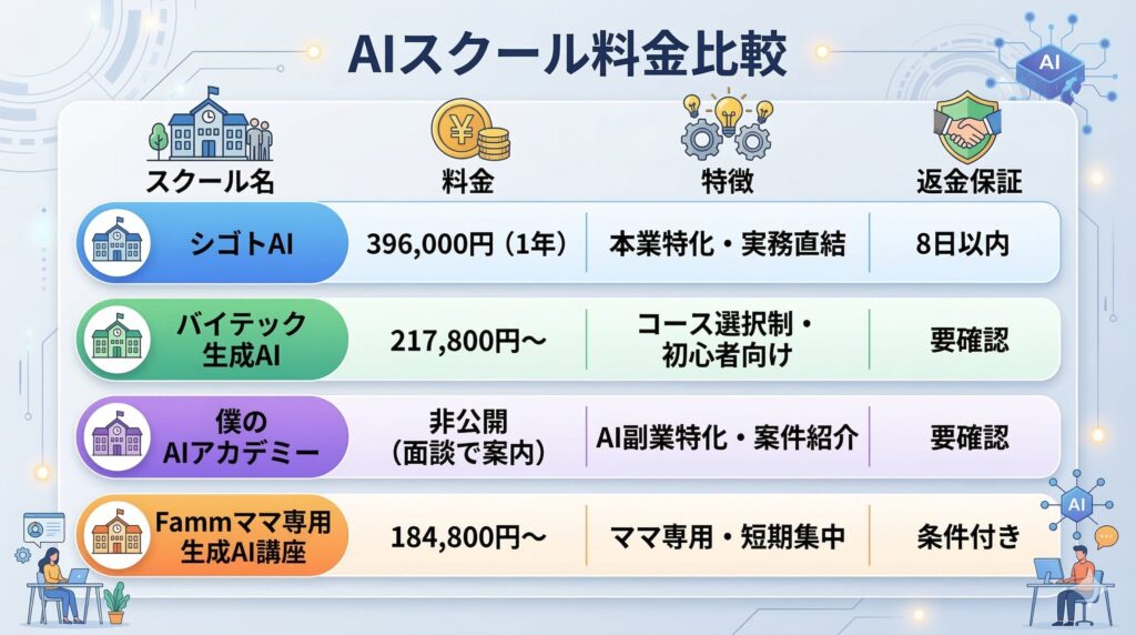 AIスクール自体がまだ新しい分野のため、副業スクールやオンライン講座と同じ感覚で見ると、情報の出し方に違和感を覚える人も少なくありません。